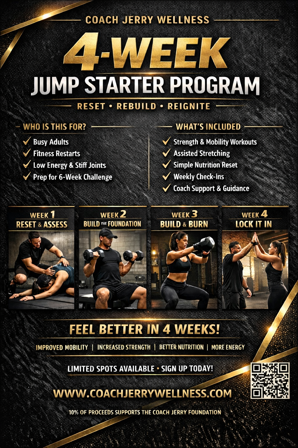 The 4-Week Jump Start Program is a structured coaching experience designed to help you reset, build consistency, and regain momentum. You’ll meet 2× per week for 45-60-minute sessions, in person or virtually, focusing on personalized strength training, mobility work, and accountability to help you move better, feel stronger, and create habits that last.BONUS 6 week challenge included